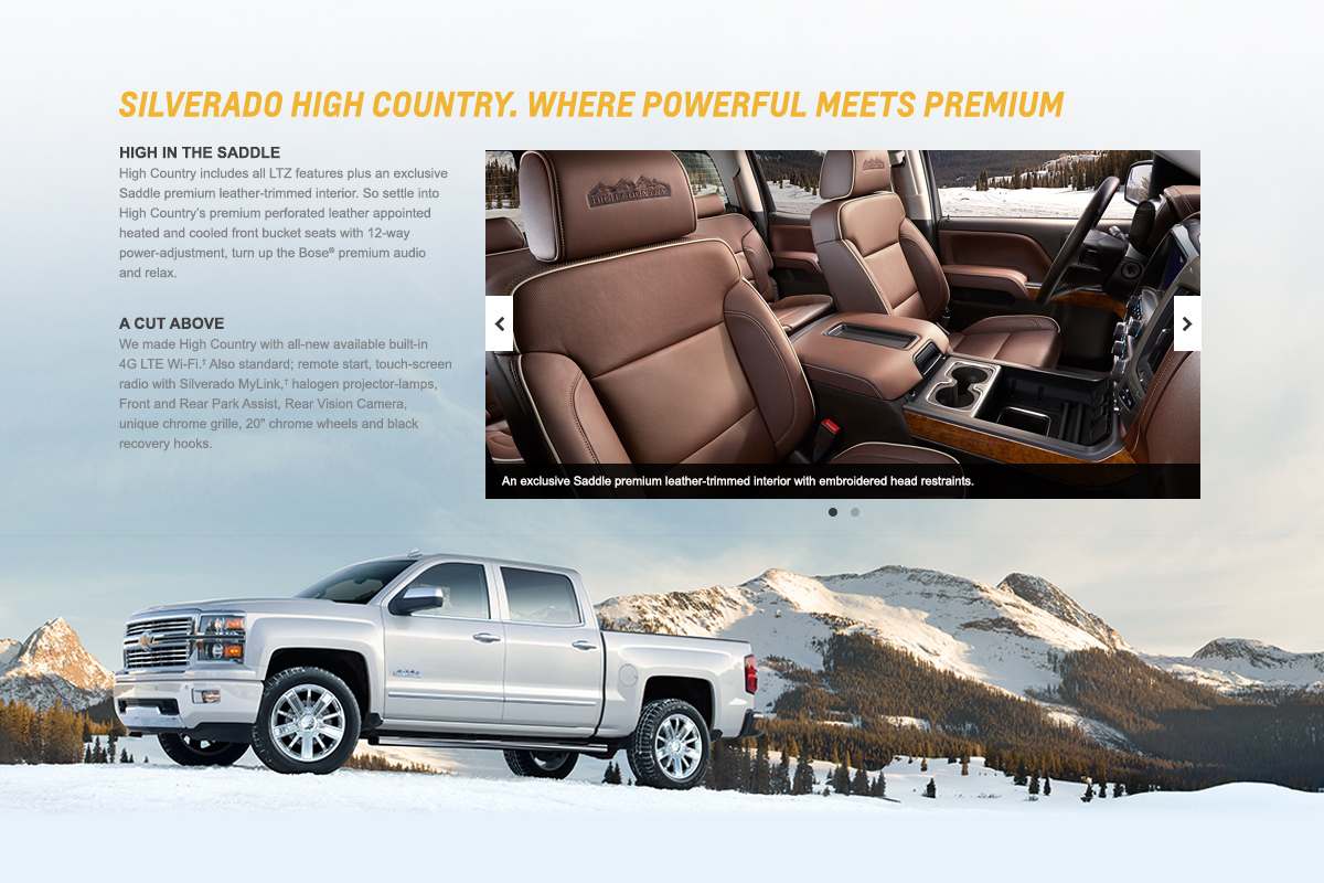 The 1500 LD Silverado site educates and inspires. It connects with the user in ways it has never done before. It carries an aspiring look and feel and uses visual cues that portray the global Chevy brand.
