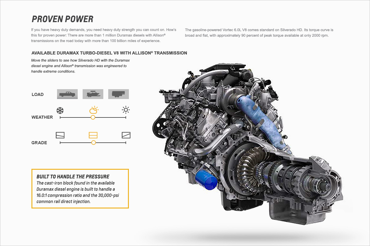 Interaction design was a significant aspect of this project. Through a variety of engaging interactive elements, we highlight and educate consumers about the key features of the truck and increase the time they spend on the site.